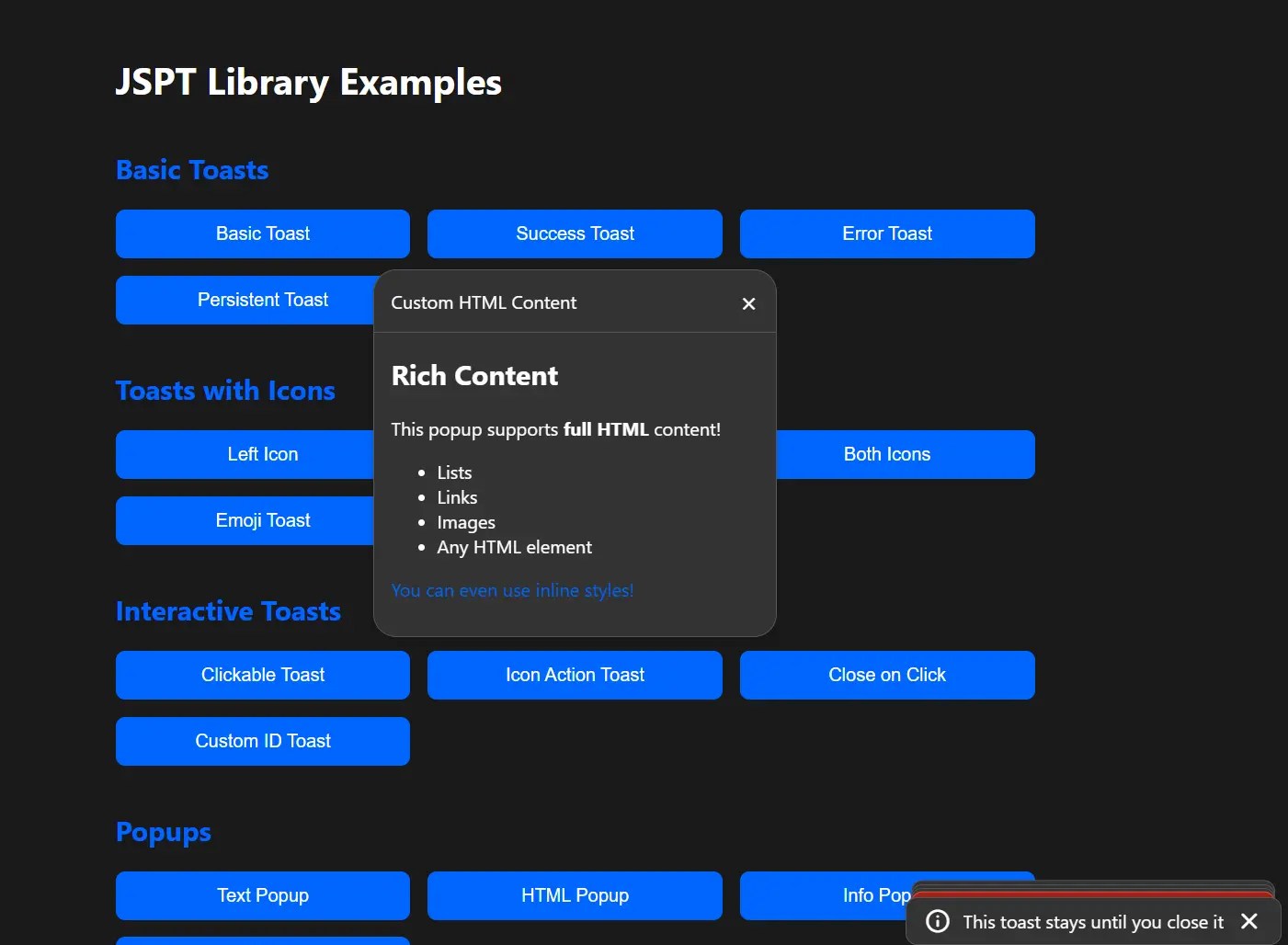 Modern JavaScript Toast Notification & Modal Popup Library – JSPT