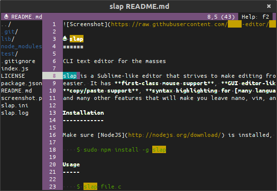 slap is a Sublime-like terminal-based text editor that strives to make editing from the terminal easier.
